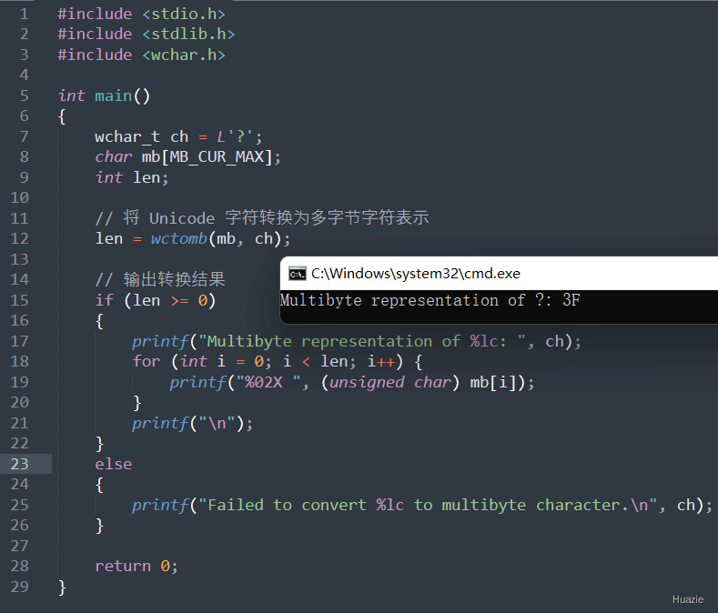 wc 转换为其对应的多字节字符表示,存储在 s 指向的字符数组中;s 是空指针,则不执行任何操作,只返回转换所需的字符数;-1。#include <stdio.h>