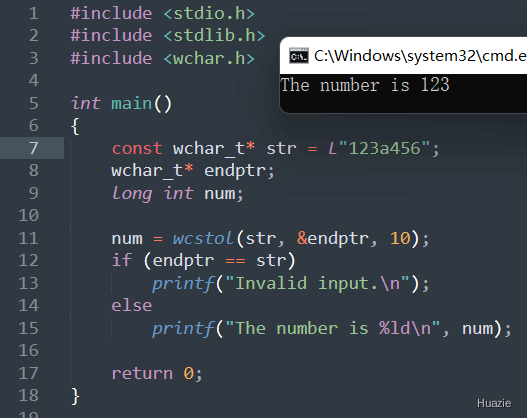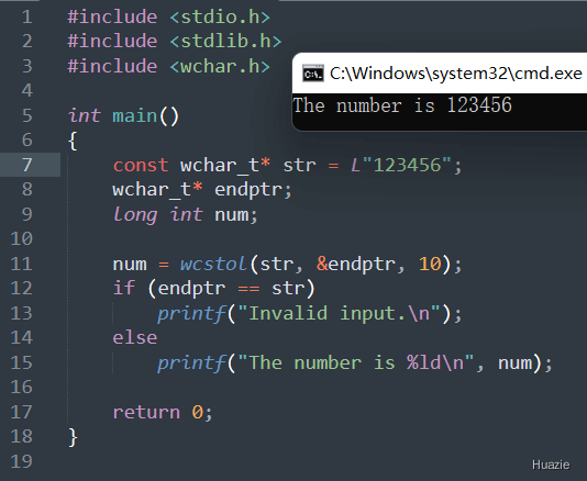 }注意: 如果输入字符串无法转换为数字,则 wcstol() 函数返回 0,并将 endptr 指向输入字符串的起始位置。所以,在使用 wcstol() 函数时,建议检查 endptr 和 str 是否相同,以确定输入是否有效。
