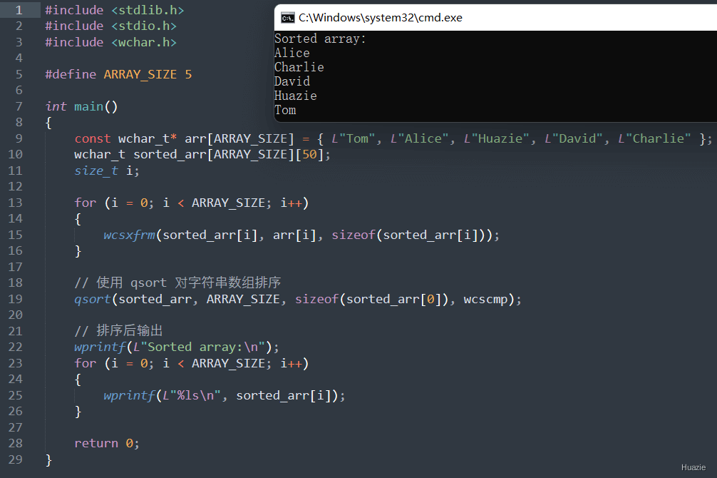 5 个 Unicode 字符串的字符串数组 arr,每个字符串代表一个人名;5x50 的二维字符数组 sorted_arr,用于存储排序后的字符串;wcsxfrm() 函数将每个 Unicode 字符串转换为可排序字符串,并将结果存储在 sorted_arr 数组中;qsort() 函数按字典序对 sorted_arr 数组中的字符串进行排序;wprintf() 函数输出排序后的字符串;