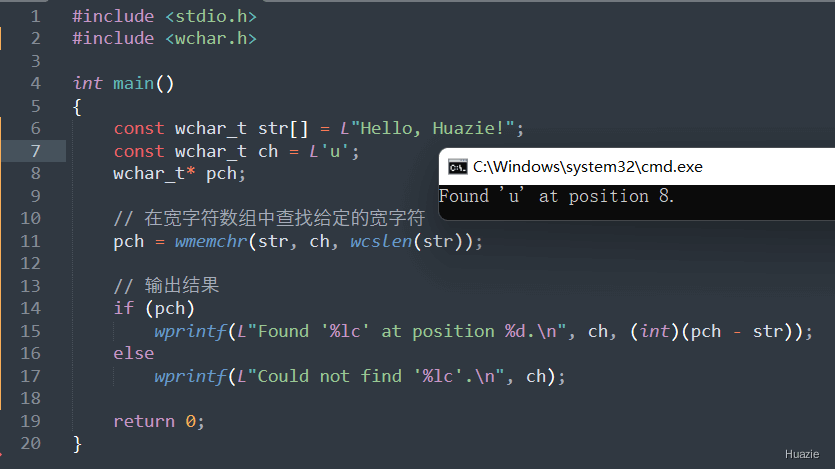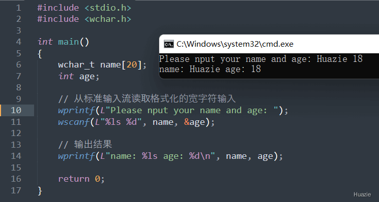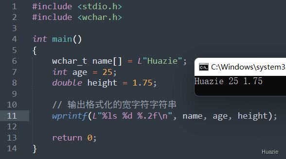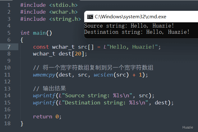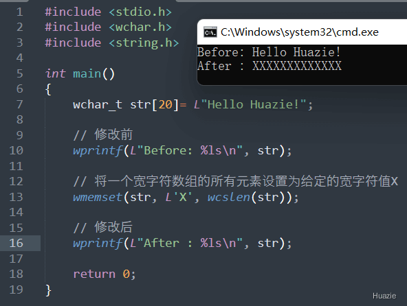 "Hello Huazie!";wprintf() 函数输出修改之前的宽字符数组 str;wmemset() 函数将宽字符数组 str 的所有元素都设置为 ‘X’;wprintf() 函数输出修改之后的宽字符数组 str,并结束程序。