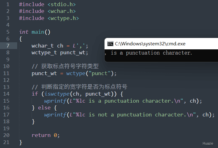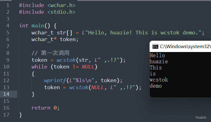 wchar_t str[] = L"Hello, huazie! This is wcstok demo.";