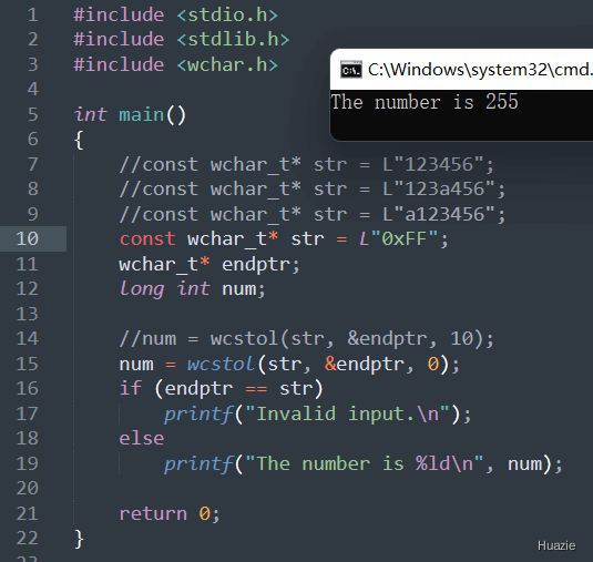 当 base 参数为 0 时,wcstol() 函数会自动检测数字基数:"0x" 或 "0X" 开头,则将基数设置为 16。"0" 开头,则将基数设置为 8。10。#include <stdio.h>