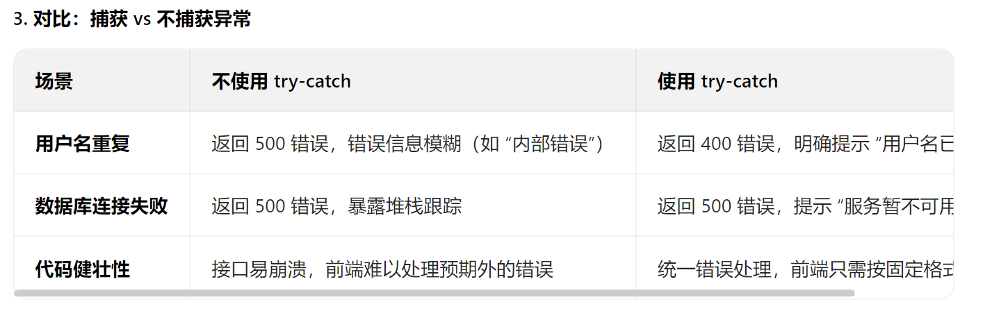 用户看到的提示可能是 “服务器内部错误”,而非友好的 “用户名已存在”。