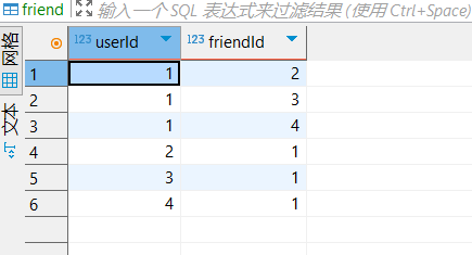 用来关联用户的好友 1.userId 2.friendId 可以通过userId,查friendId。得到他的好友都是谁