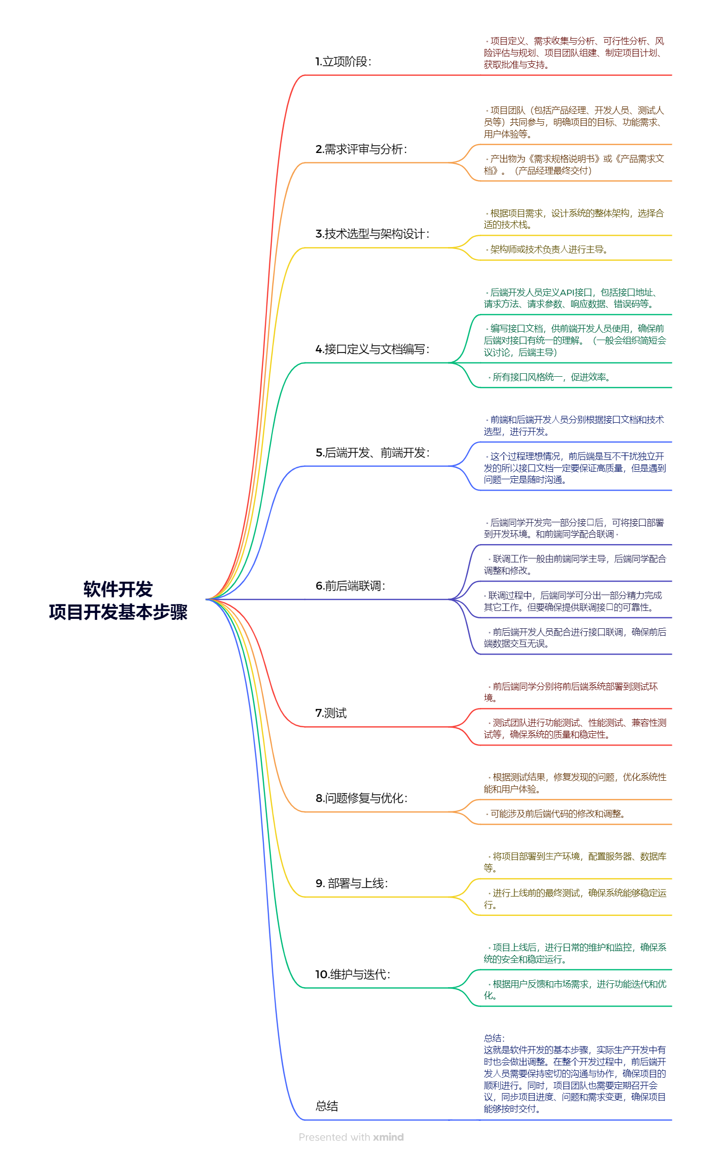 这就是软件开发的基本步骤,实际生产开发中有时也会做出调整。在整个开发过程中,前后端开 发⼈员需要保持密切的沟通与协作,确保项目的顺利进行。同时,项目团队也需要定期召开会议,同步项目进度、问题和需求变更,确保项目能够按时交付。