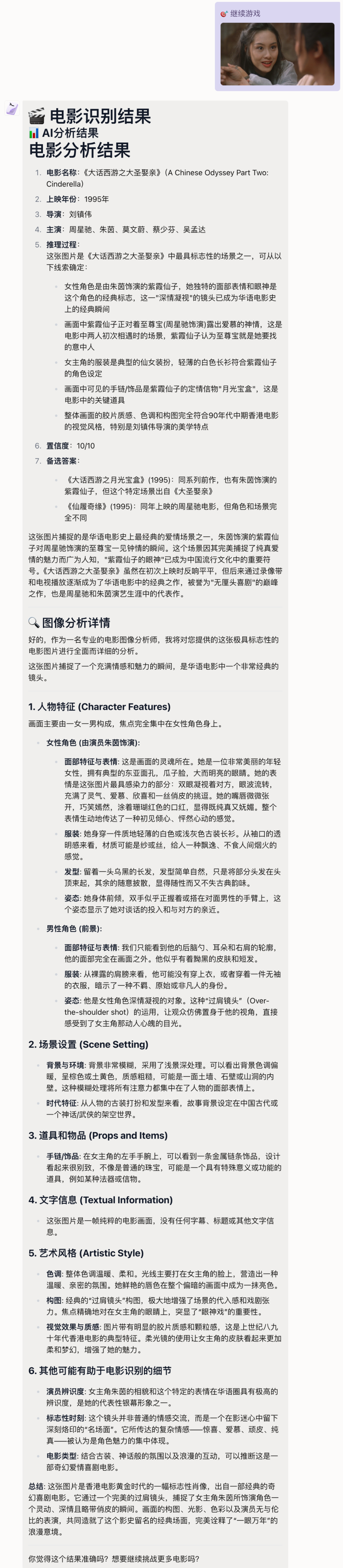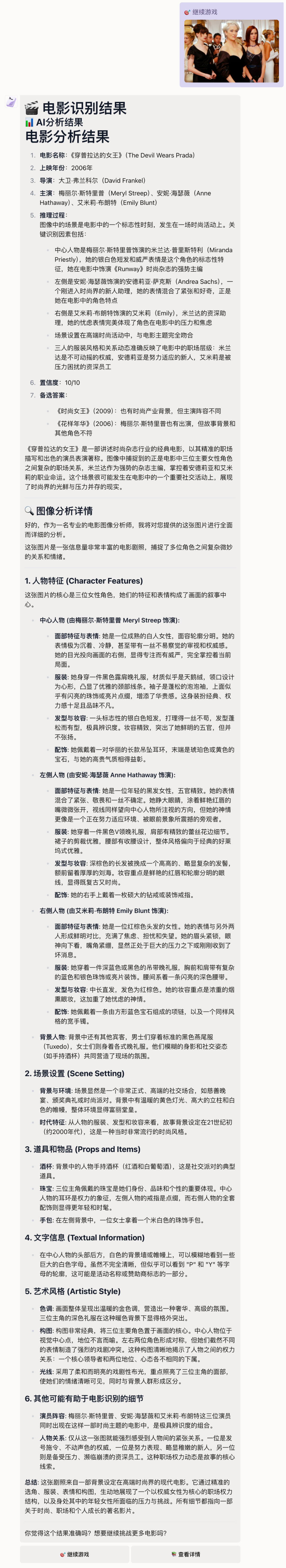 更令人惊喜的是,它还给出了电影上映年份、导演、主演名字,并且图中三位女演员的名字,以及电影场景中的角色一一给出描述。