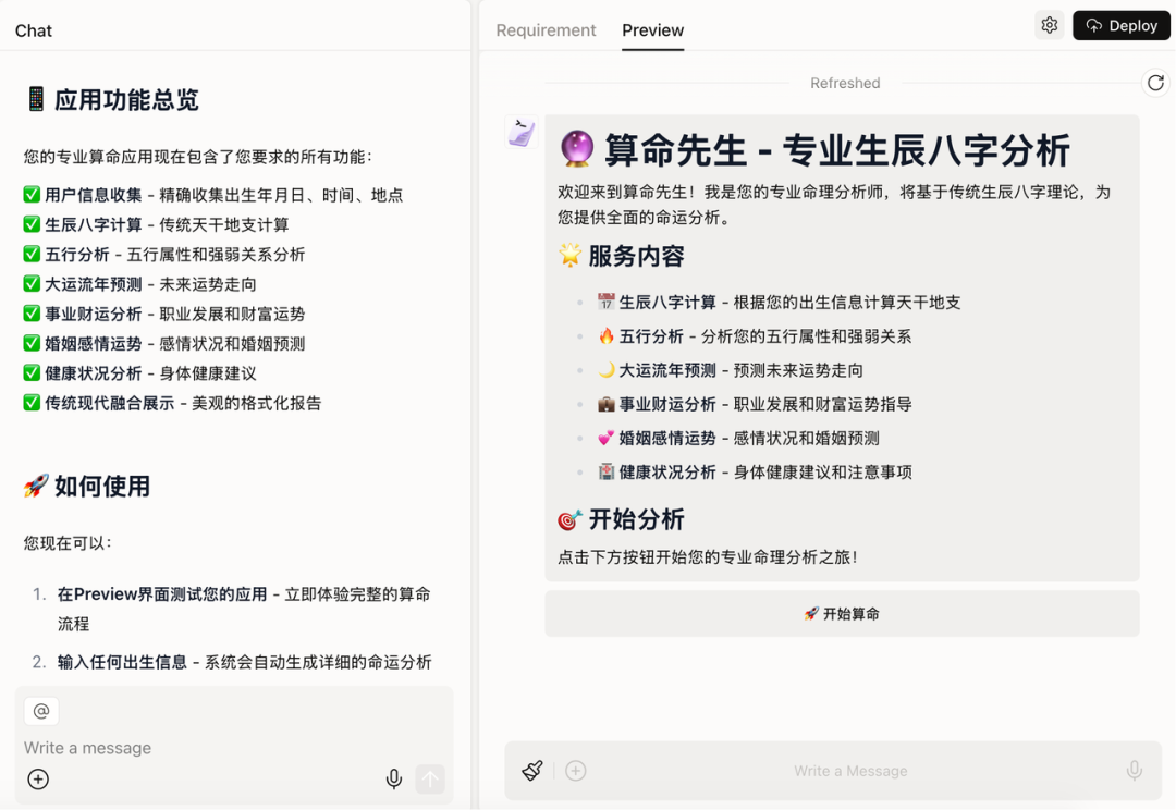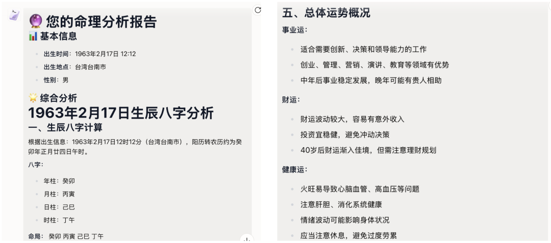 很快,ShellAgent生成了一个生辰八字分析器——只需输入出生年月和地点,就能分析出这个人的运势、五行、事业、婚姻情感等等。