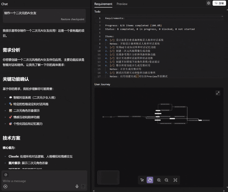 在右侧,我们可以实时追踪它的任务清单和标记用户旅程的流程图,所有这些都能作为上下文,随时调整!