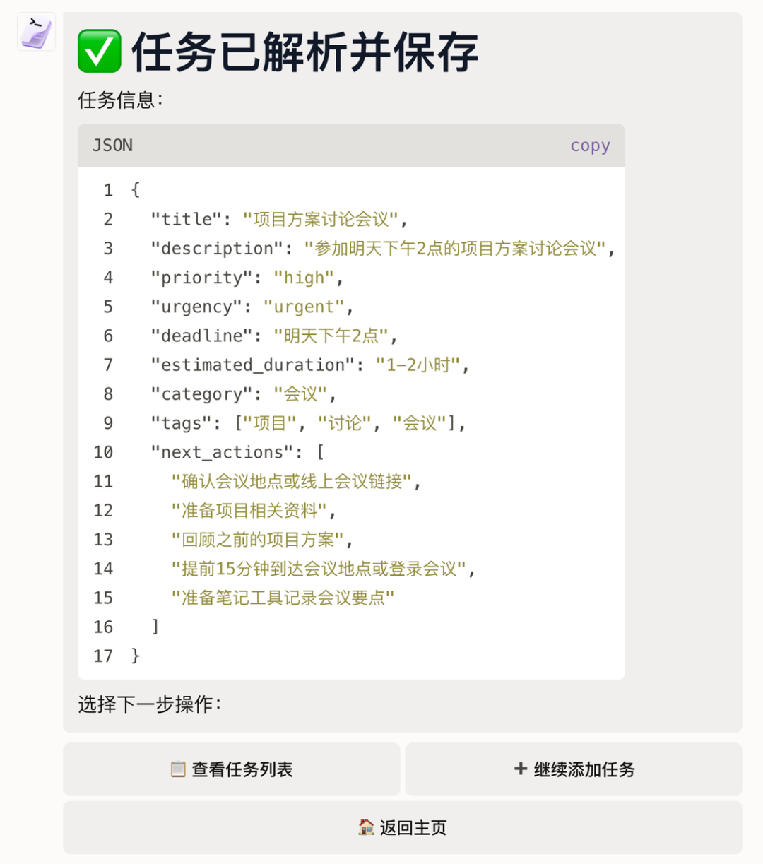 首先,添加一个「明天下午2点开会讨论项目方案」,它会根据要求,给出优先评级,下一步行动建议。
