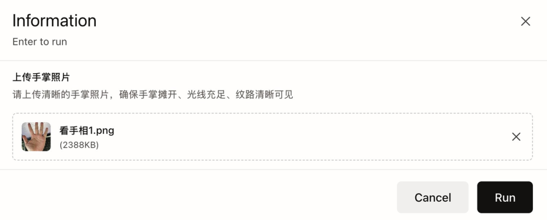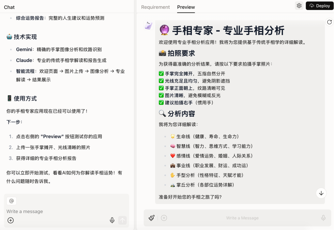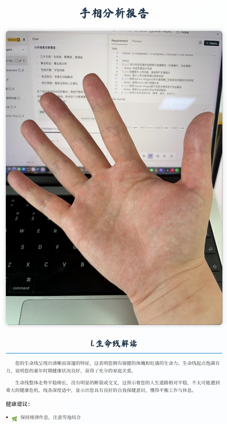 Prompt:帮我打造一个看手相专家,只需输入手掌照片,就能测算我的运势