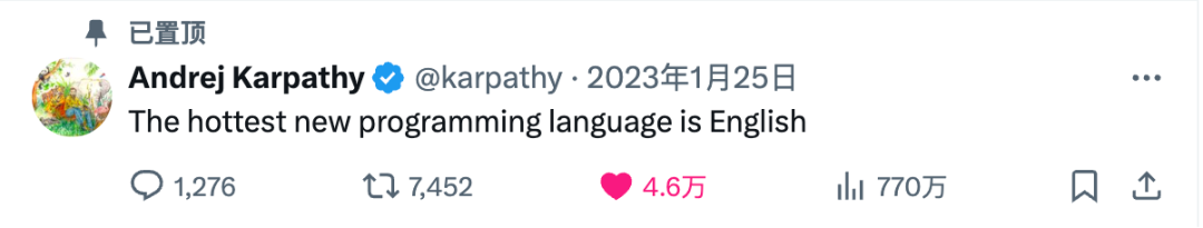 提出氛围编程的Karpathy在他的个人账号上始终置顶的一句话就是「英语(他的母语)是未来的编程语言」。