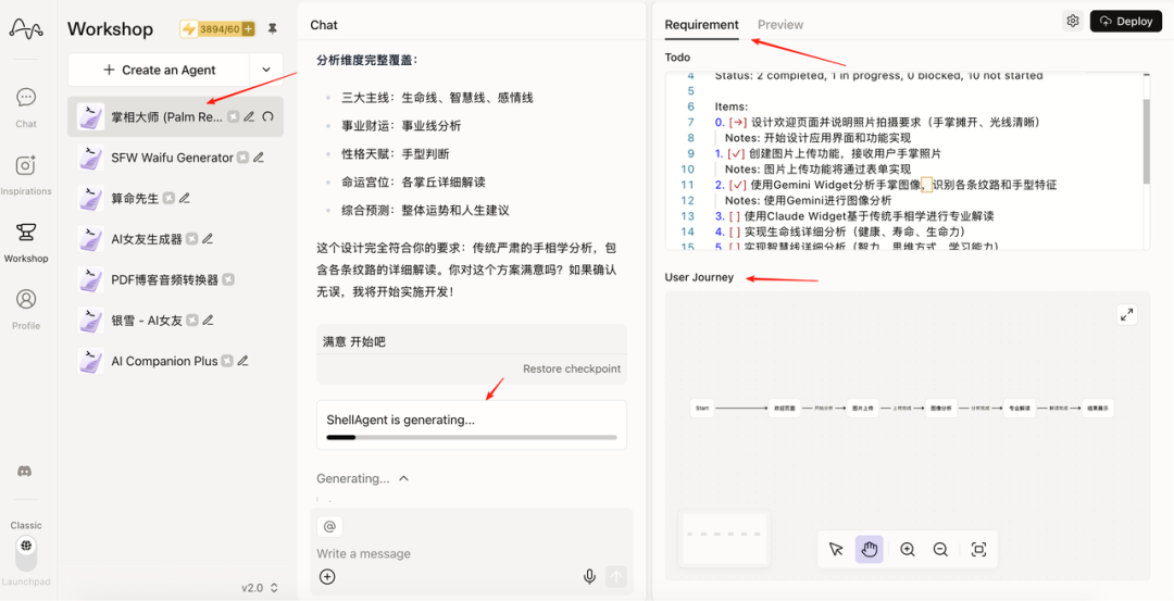 依然是端到端的text2app,而且ShellAgent还提供了一个「User Journey」功能,可以通过该功能概览APP的创建过程。