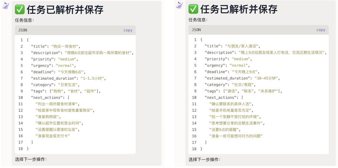 随后,我们又添加了两项新任务,「傍晚6点去超市买一周的食材」、「晚上9点给朋友或家人打个电话,聊聊近况」。
