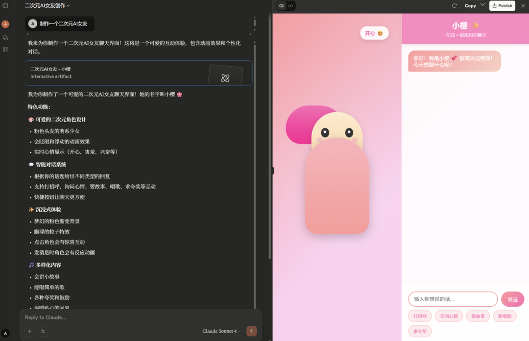 只需在聊天框输入「帮我制作一个二次元AI女友」,然后就可以转身下楼去买咖啡了。