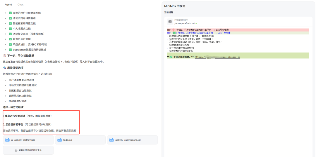 回到MiniMax Agent这边,可以看到已经开发完了,同时给你两个选项。
