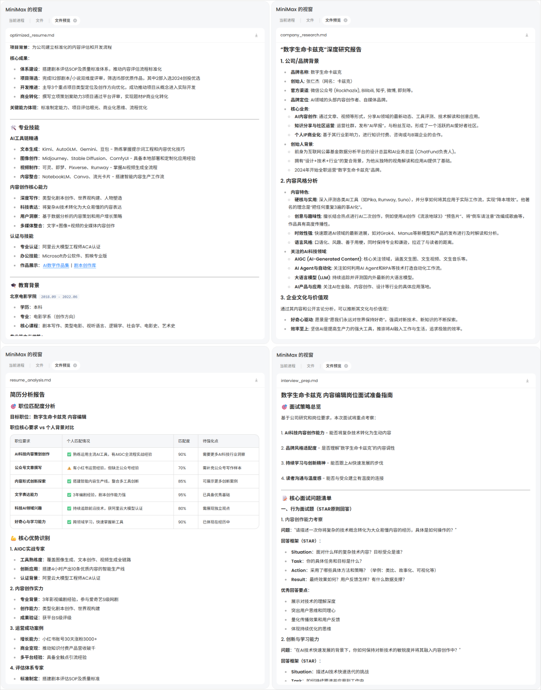 当你把你的简历和Prompt,扔给MiniMax Agent之后,他就会给你全部跑完,然后咱们再正常全面测试一下。