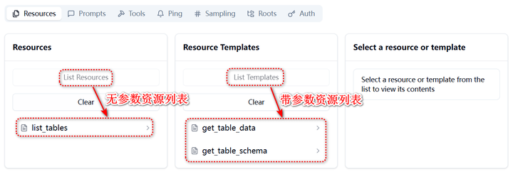 点击 Resources,然后点击下方的 List Resources、List Templates,可以查看资源 list。