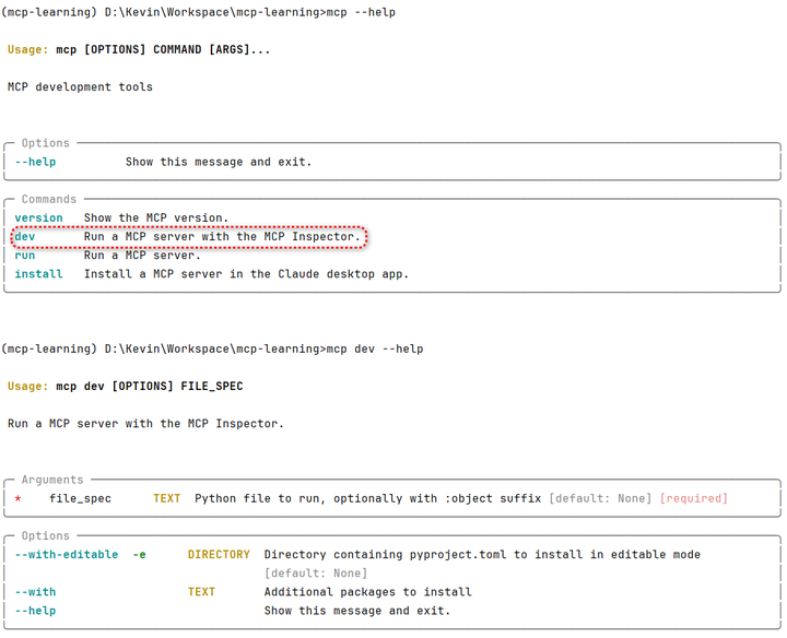 在终端运行 mcp --help,可以查看 mcp 命令的用法(由下面的返回结果可知,可以通过 mcp dev 命令运行 mcp inspector):