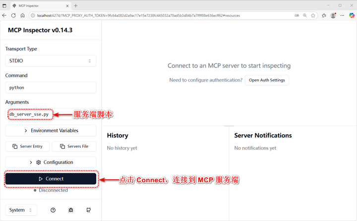 打开 mcp inspector 的页面,点击左侧的 connect 按钮,连接到 mcp 服务端: