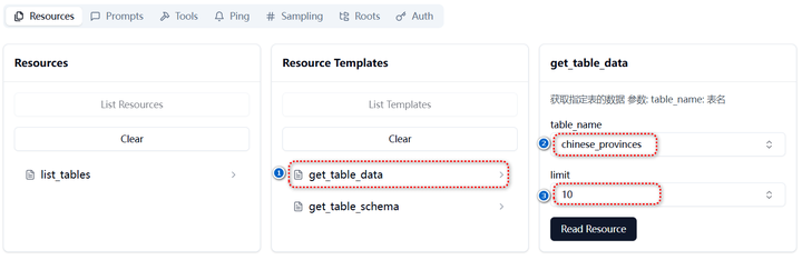 查看具体某张数据表的数据内容。点击 get_table_data 资源,输入表名参数和 limit 参数,点击 Read Resource,可以查看 mcp 服务端返回的数据表数据: