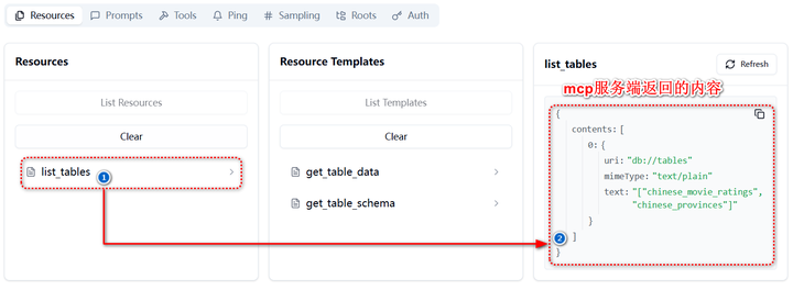 查看数据库的数据表清单,点击资源 URI list_table 后,右侧可以查看到 mcp 服务端返回的内容,目前数据库有两张数据表,分别是 chinese_provinces、chinese_movie_ratings 两张表: