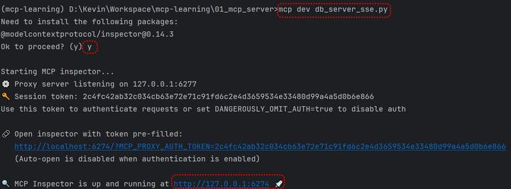 运行命令:mcp dev db_server_see.py( mcp dev 命令默认使用 stdio 通信方式来启动 mcp 服务端),对上面开发的 mcp 服务端功能进行测试。点击输出的链接,即可打开浏览器,进入 mcp inspector 用户界面: