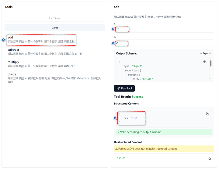 点击 Tools 下的 List Tools,列出全部工具,选择其中一个,输入参数,点击 Run Tools,即可调用工具,获取返回的运行结果: