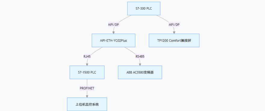 设备层:S7-300通过MPI/DP连接以太网模块,模块RS485口级联3台ACS580变频器(菊花链拓扑)。