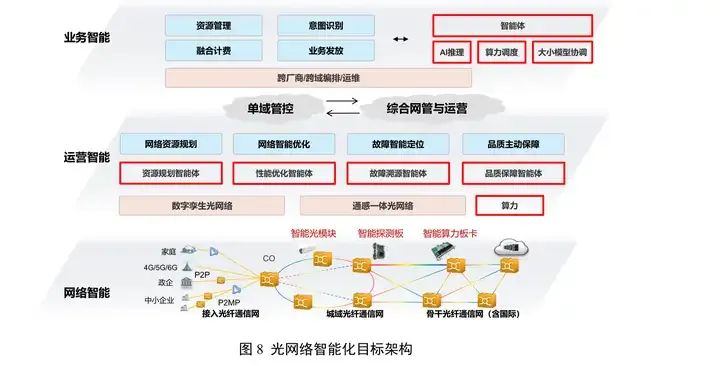 场景专用网络:智算中心光网络(全光高速互联)、工业 PON 光网络(一网承载多子网)。 光网络智能化:涵盖通感一体(网络 / 业务 / 环境感知)、数字孪生(数据 / 模型 / 服务 / 交互层)、人工智能(全生命周期自智)技术要求。