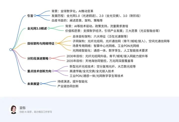 《中国电信全光网3.0 技术白皮书》阐述了在全球数字化与 AI 加速发展背景下,全光网 3.0 的背景、目标架构、分阶段演进策略、重点技术及未来展望。其以 “全光智联” 为核心,愿景是实现 “光云智融合、光感业融合、天地海融合”,具备泛在光速联、新型光媒质、动态光链接、原生光智能、多维光感知、分级光承载六大特征,计划分 2030 年、2035 年两阶段演进,重点突破新型光纤光缆、高速传输等技术,旨在构建支撑 AI 时代的新型信息基础光网络。