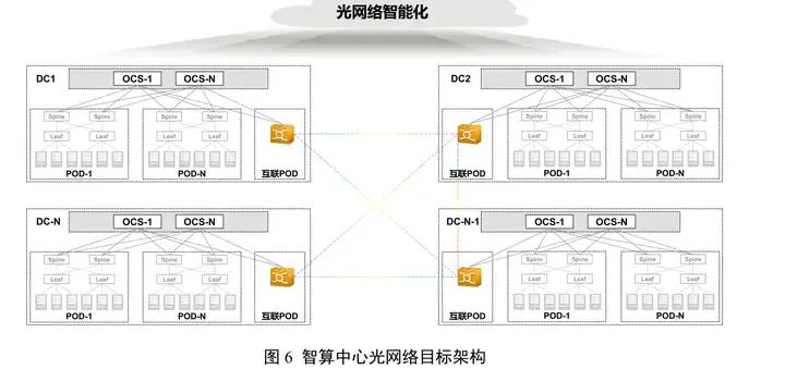 智算中心内部大规模算力互联:全光交换机(OCS)在部分超大规模数据中心内替代传统电架构的核心层交换机,未来甚至进一步下沉部署于超节点内,实现智算中心内各算力节点间的大容量无阻塞互联。未来引入芯片出光与光电合封技术,如共封装光学(CPO),进一步降低卡间互联功耗与延迟,提升卡间互联带宽密度,实现智算中心内部更强算力、更大规模的高效互联。 智算中心内外网络融合:在管控层和设备层需要具备协同的能力,光传送网(OTN)设备需感知远程直接内存访问(RDMA)协议,实现各智算中心之间的数据无损传输。融合网络基于跨域算力调度能力,依托算网协同的运营平台实现算力资源的状态感知与统一调度,灵活 供给互联带宽。结合波长动态拆建能力,网络可根据任务类型和业务负载精准配置光层资源,提升智算光网络资源调配效率与服务弹性。构建“芯片—机柜—集群”全光化链路,全面释放智算网络的性能潜力。 智算中心网络目标架构的实现,在技术上主要依托超高可靠的弹性带宽技术、50ms 波长重路由恢复技术、OCS 技术,以及先进的光电封装技术。