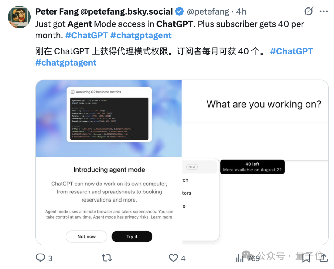 目前ChatGPT Agent已开放使用,Plus用户每月有40次使用额度。