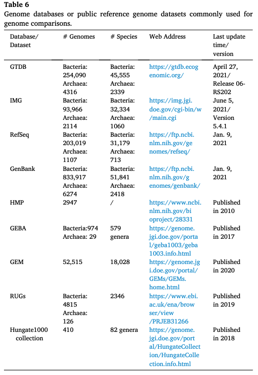 通常,研究人员通常会将MAGs与各类公共微生物基因组数据库结合使用。目前,常见且常用于物种分类注释的数据库包括Genome Taxonomy Database(GTDB)、Integrated Microbial Genomes(IMG)、RefSeq和GenBank等。此外,还有一些针对特定环境或分离菌株的参考基因组数据库,如人类微生物组计划(HMP)、细菌与古菌基因组百科全书(GEBA)、地球微生物基因组(GEM)、瘤胃未培养基因组(RUGs)以及Hungate基因组目录等(见表6)。