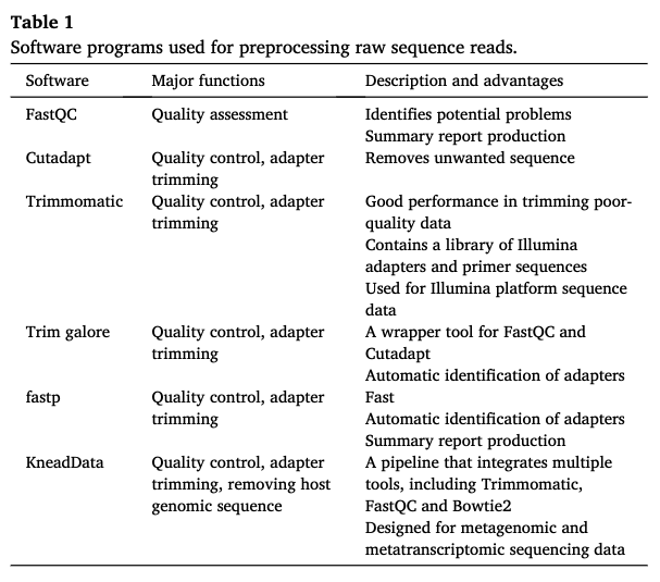 高通量测序平台通过在建库过程中添加双端indexed barcodes,可以同时对多个样本进行测序,从而区分每个样本的测序reads。然而,从样本采集、DNA提取、文库构建到测序,每个步骤都可能引入来自宿主、人类或周围环境的污染物。同时,文库制备和测序过程中还会产生序列错误、碱基含量偏差和序列高表达等问题。因此,测序reads的预处理对于后续分析至关重要。