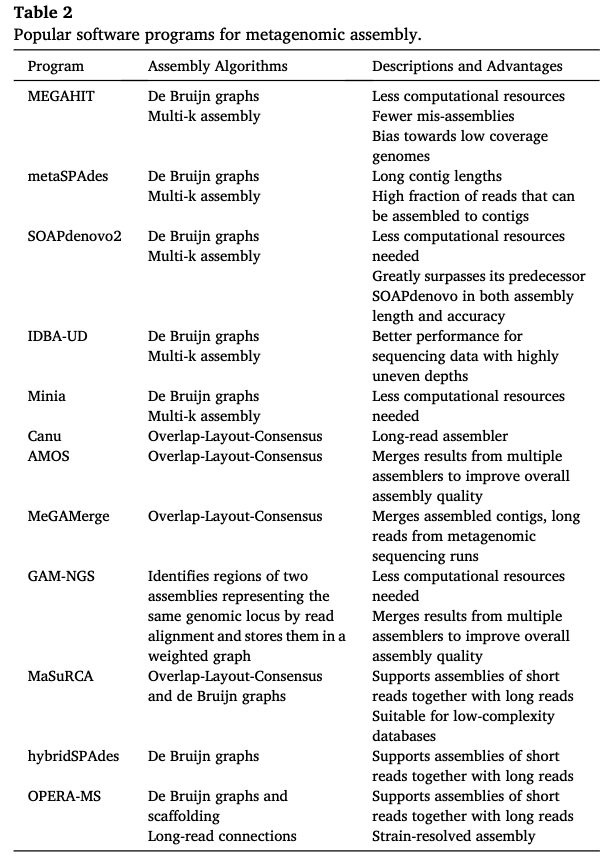 AMOS 和 MeGAMerge 是采用 OLC 方法的鸟枪法宏基因组组装软件,它们通过整合多个组装器的结果来提升整体组装质量。此外,GAM-NGS 也可以合并不同的组装结果,从而提高组装的连续性和准确性。与传统的全局比对方法不同,GAM-NGS 通过 reads 比对识别两个组装结果中代表同一基因组区域的片段,并将这些片段存储在加权图中。Canu 是专为处理 PacBio 或 Oxford Nanopore 等长reads测序平台生成的长reads数据而设计的组装工具。混合组装(hybrid assembly)方法则结合了二代测序数据的高准确性和三代测序数据的长reads优势,相比单独使用短reads或长reads组装,能够获得更高质量的 contig,能够更好地解析复杂的重复DNA片段。目前,常用的混合组装软件包括 MaSuRCA、hybridSPAdes 和 OPERA-MS 等。