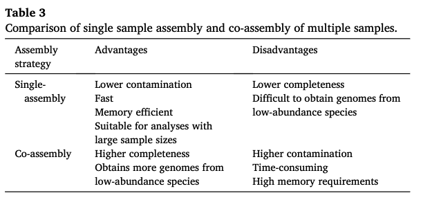 宏基因组序列组装策略主要包括单样本组装和多样本联合组装(见表3)。联合组装能够获得更多、更高完整度的基因组,尤其有助于回收丰度较低物种的基因组,但同时也会导致更高的污染风险。为了提高reads组装成contig的比例以及组装结果的准确性,可以结合单样本组装和多样本联合组装的方法。然而,随着数据量的增加,联合组装对计算资源的需求也大幅提升,因此这种策略并不适用于样本量较大的大规模数据集。通过联合组装获得的基因组可以视为群体水平的基因组。如果联合组装中包含了不同类型样本的reads,最终组装出的contig质量可能会有所下降。
