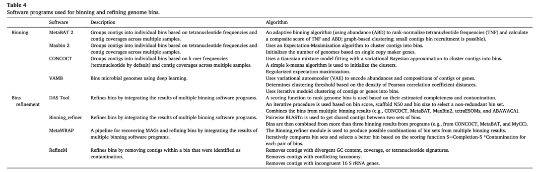 宏基因组binning是指将来自同一物种甚至同一菌株的序列归为同一个基因组bin。根据聚类的序列类型不同,binning可以分为read binning、contig binning和gene binning。近年来,contig binning已成为组装基因组bin的主要方法。通常,MAGs是通过对contig进行binning,基于核苷酸组成或reads丰度等信息进行分类得到的。常用的binning工具主要包括MetaBAT 2、Maxbin 2和CONCOCT(见表4)。其中,MetaBAT 2由于内存利用效率高,非常适合处理大规模样本数据集中构建MAGs。contig的长度对最终获得的bin数量和质量影响很大,因此大多数上述软件建议选用长度≥1000 bp的contig进行binning;而使用MetaBAT 2时,contig长度一般需≥1500 bp。Variational Autoencoders for Metagenomic Binning(VAMB)是近年新开发的一款宏基因组binning工具。VAMB通过结合丰度信息和k-mer分布,利用深度变分自编码器对序列进行编码和聚类。与MetaBAT 2相比,VAMB通常得到的bin数量较少,但在不同的最小contig长度阈值下,bin数量较为稳定且具有较好的鲁棒性。