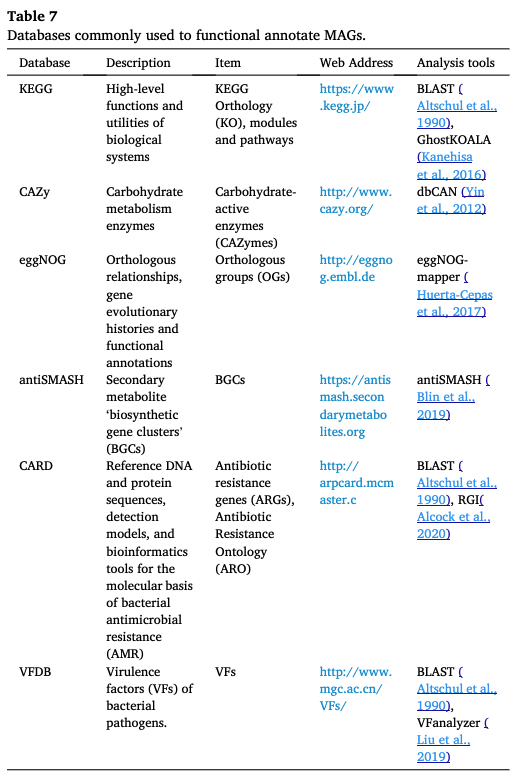 微生物培养不仅是实验验证微生物功能的有效方法,还能补充和丰富宏基因组分析推测得到的物种和功能资源库。与此同时,通过分析MAGs的基因组信息,也可以为优化微生物的培养条件提供理论依据,从而提高细菌分离和培养的成功率。有研究发现,未培养的细菌通常具有较小的基因组和较慢的复制速率,同时由于缺失许多相对保守的代谢通路,这类细菌往往也缺乏已培养菌中常见的多种基因。在MAGs的功能注释中,常用的数据库包括KEGG、CAZy、eggNOGs、antiSMASH、CARD和VFDB等(见表7)。