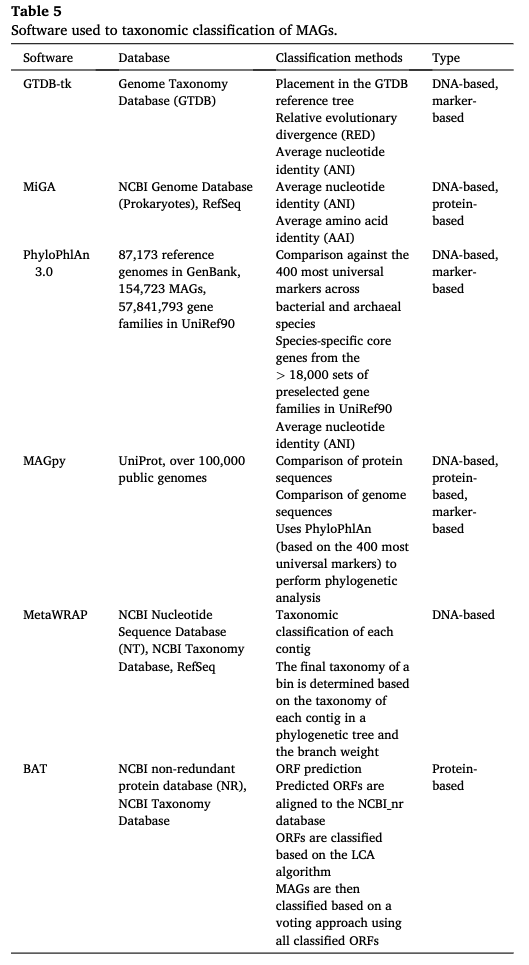 MAG的物种分类方法主要分为三类:(i)基于DNA的分类方法,如平均核苷酸相似性(ANI)和基因组序列比对;(ii)基于蛋白的分类方法,包括平均氨基酸相似性(AAI)和蛋白序列比对;(iii)基于标记基因的分类方法,依赖于物种特异性的核心基因集或通用标记基因(见表5)。MetaWRAP的分类模块采用的是DNA水平的分类方法,而BAT则通过蛋白质水平对MAGs进行分类。一些工具则整合了两种及以上分类策略,如GTDB-tk、MiGA、PhyloPhlAn 3.0和MAGpy等。其中,GTDB-tk在近年来被大量研究广泛使用。