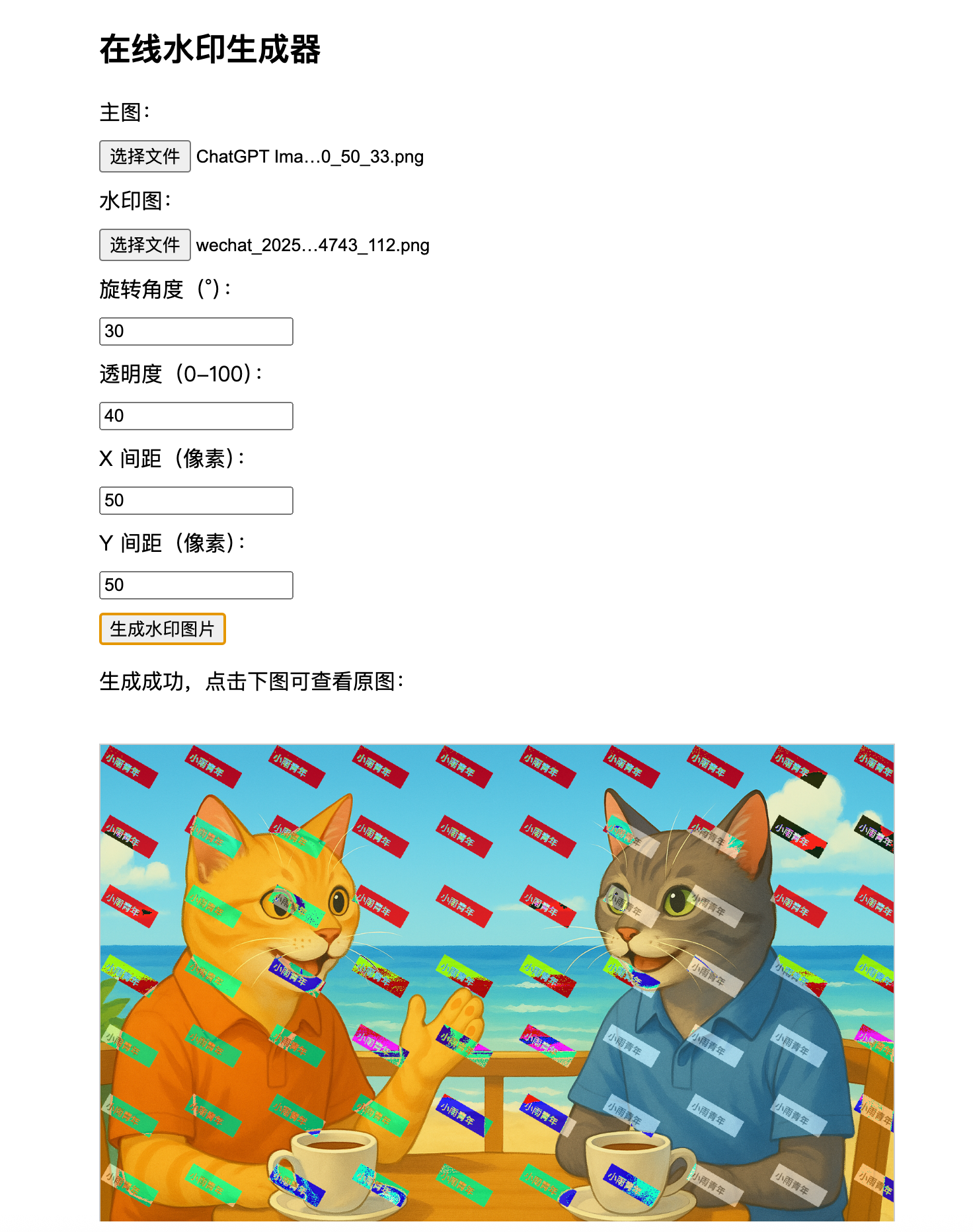 后来我就在想,如果做一个网页,把这套逻辑封装成“上传主图 + 上传水印 + 设置参数 + 一键生成”,是不是会更方便,也更适合自己和别人使用?