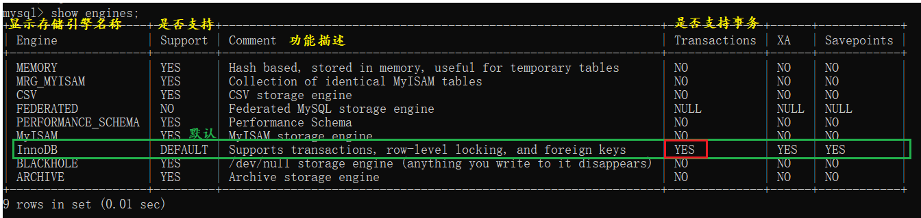 我们在使用事务之前要查看一下,MySQL是否支持事务。在MySQl中支持事务的存储引擎是InnoBD。