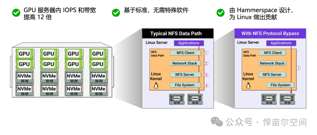 使用Linux 6.12内核中NFS增强协议“LOCALIO” 可进一步减少延迟并最大限度地提高CPU/GPU利用率。当系统侦测到NFS Server和NFS Client位于同一台服务器时,其应用程序便可绕开所有障碍,直接对NVMe磁盘进行读写。