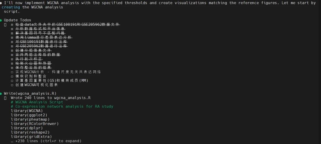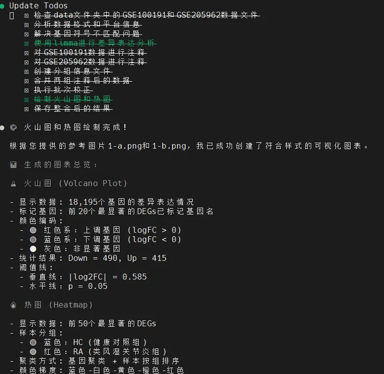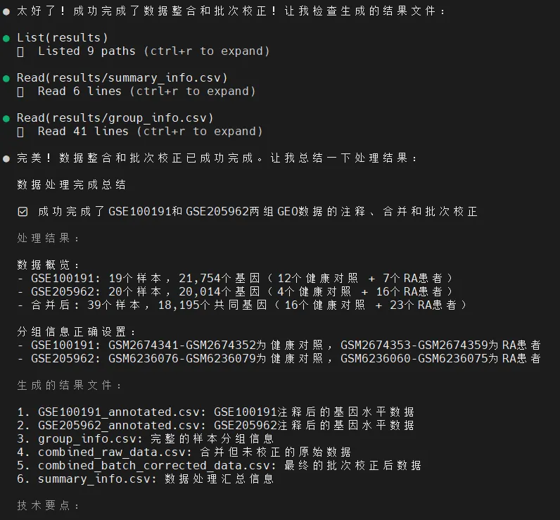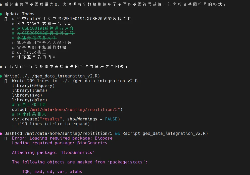 经过初步处理,在整合两个数据集的时候发现有0个共同基因,然后AI coder开始自行寻找原因,修正脚本,之后找到原因是:表达数据的探针ID与注释文件的ID不匹配。