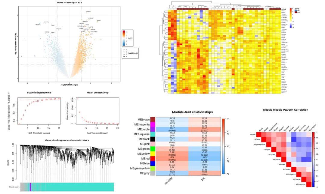 This is a bioinformatics project focused on rheumatoid arthritis (RA) gene expression analysis. The goal is to identify potential disease genes through differential expression analysis and weighted gene co-expression network analysis (WGCNA), ultimately generating five diagnostic figures as shown in Figure 1 of the accompanying research paper.