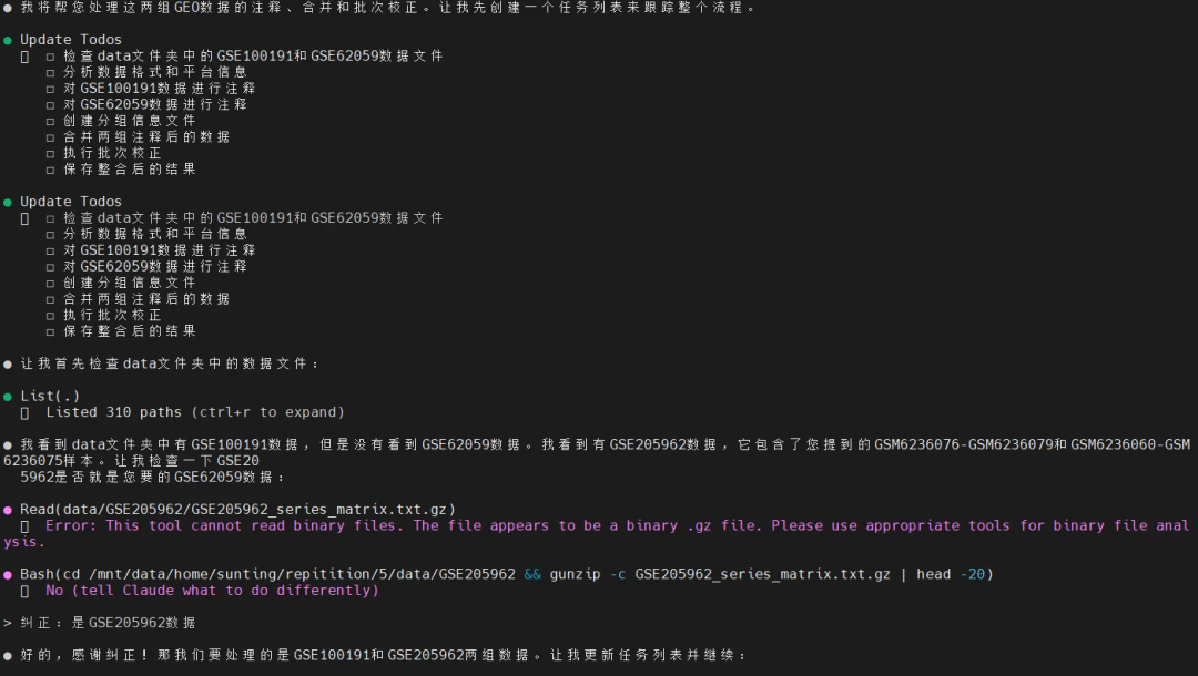 处理好先行条件,就可以命令AI coder 开始执行了,首先需要对GSE100191和GSE62059两组GEO数据分别做注释,然后整合去批次。