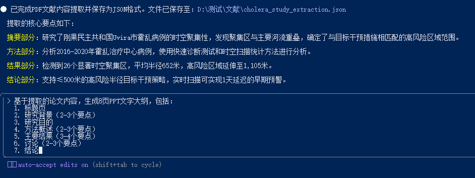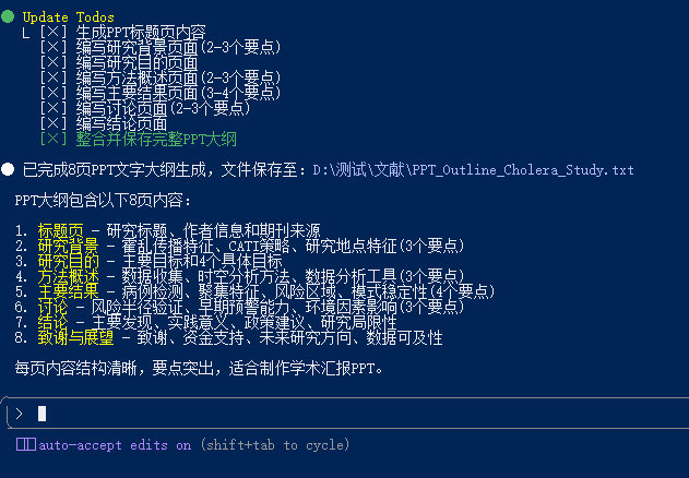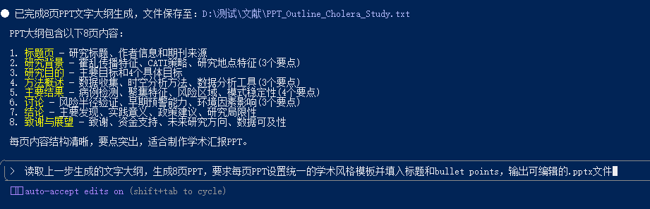 基于上一步识别提取到的内容,让Claude code生成一个文献PPT大纲,这里您可以详细指明PPT的使用场景(例如用于学术汇报),方便Claude code深入理解需求。