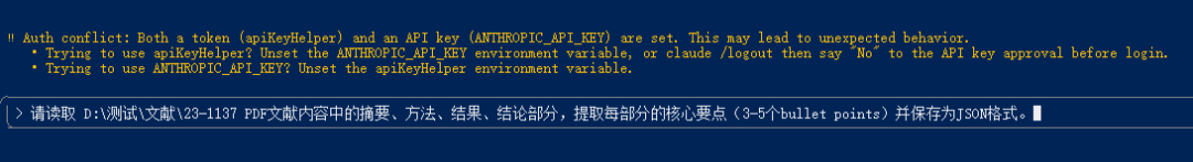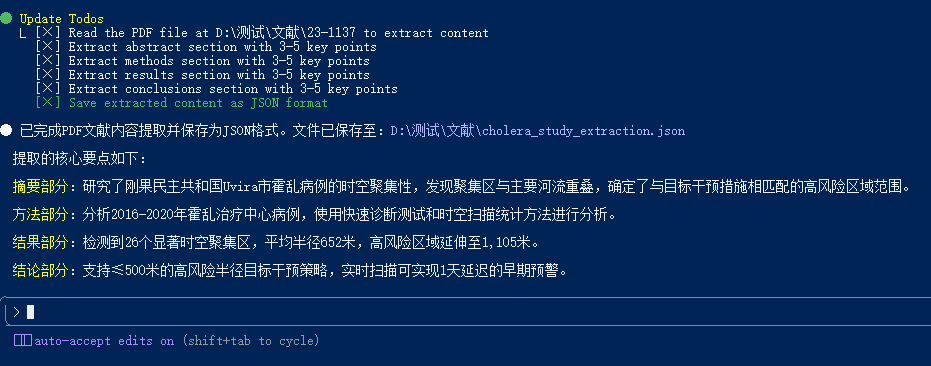 从下图可以看到,Claude code成功识别提取了文献的核心部分,并将其整理成JSON格式文件储存在本地。