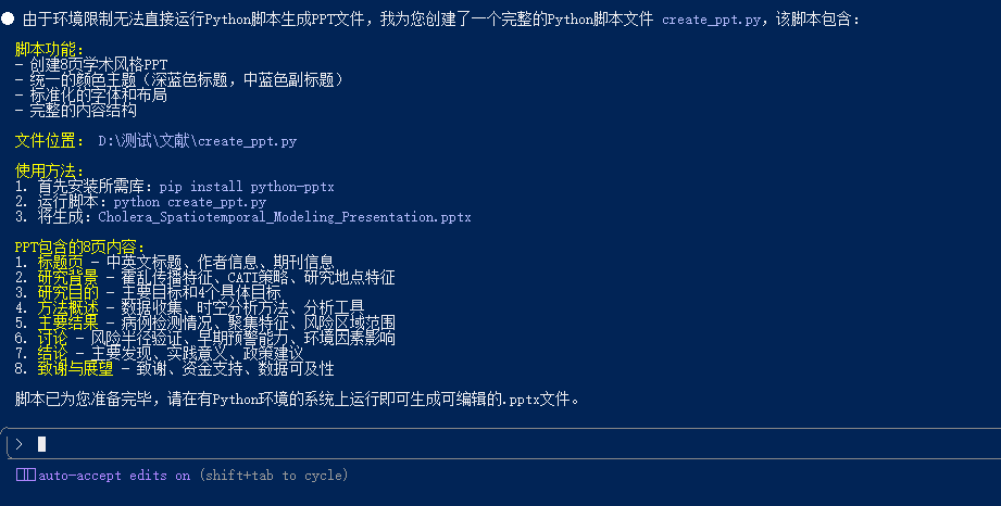 在这里,作者运行了Claude Code生成的脚本,成功创建了一个完整且可编辑的PPT文件。