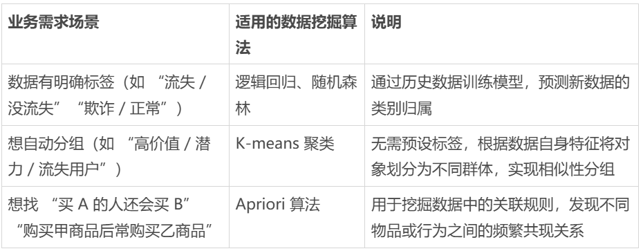 如果说数据库查询是"知道问题找答案",那数据挖掘就是"不知道问题,但从数据里找可能有用的线索"。