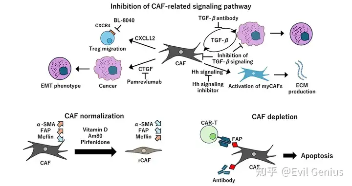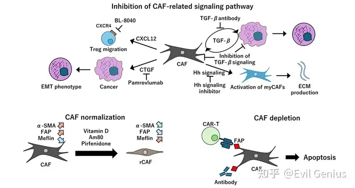 ✓ PDAC中癌细胞过表达的Shh(Hh家族配体)诱导CAFs富集的TME,但Shh缺失反而导致侵袭性肿瘤 ✓ 使用Smoothened拮抗剂抑制Hh信号: ▪ 减少抑癌型myCAFs,增加促癌型iCAFs ▪ 导致CD8+ T细胞减少和Tregs增加 ✓ 但Hh抑制可促进血管正常化,通过减少ECM增强吉西他滨渗透